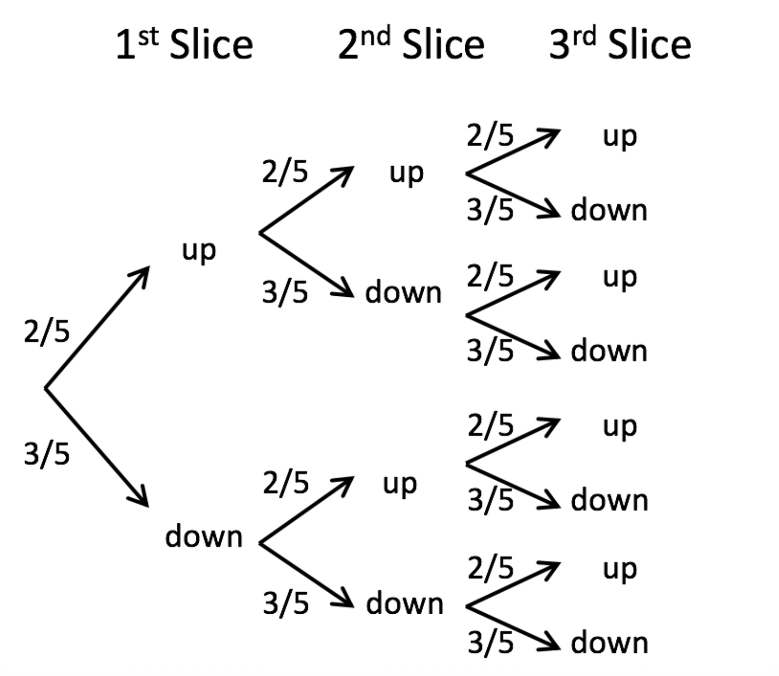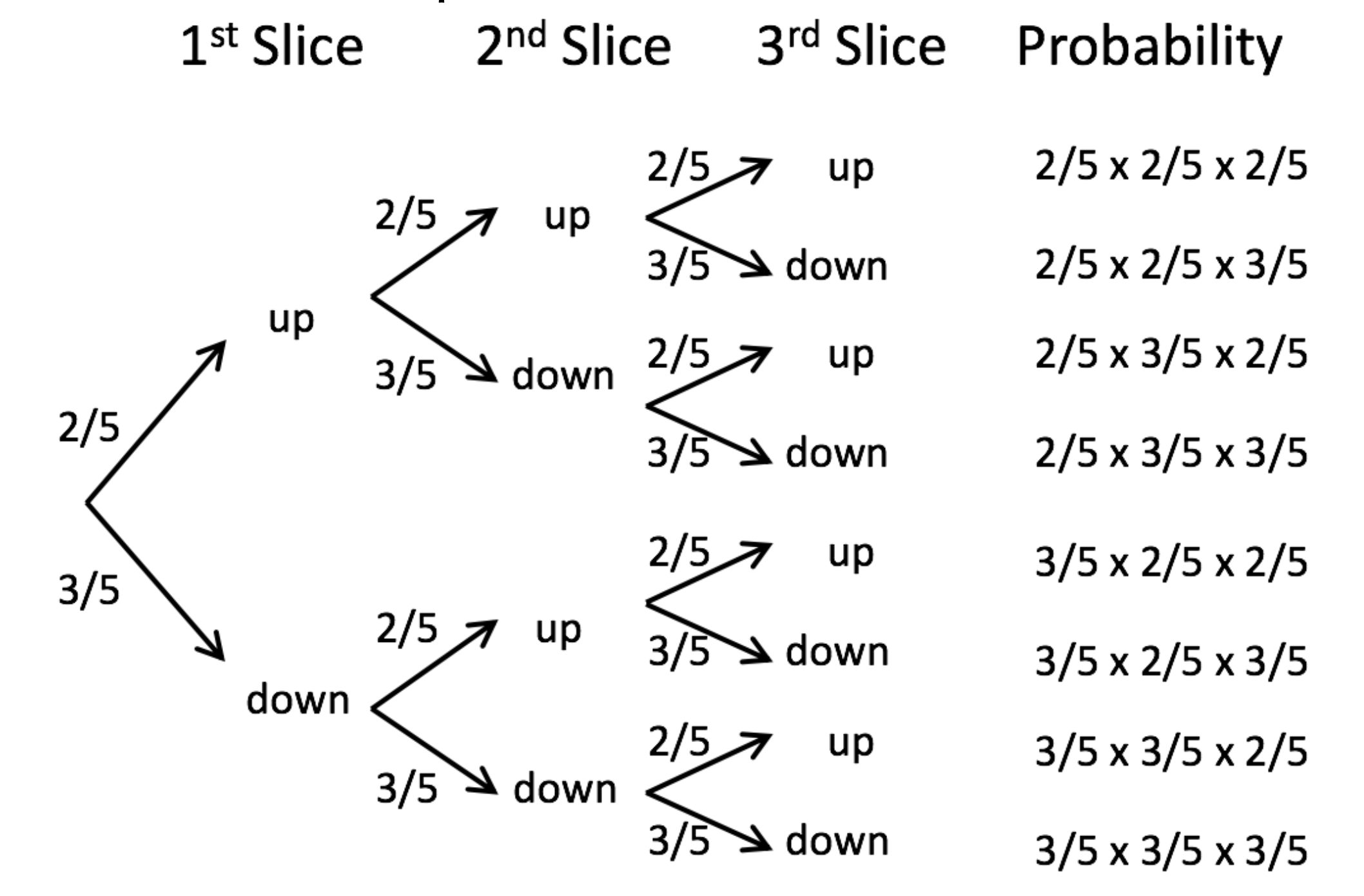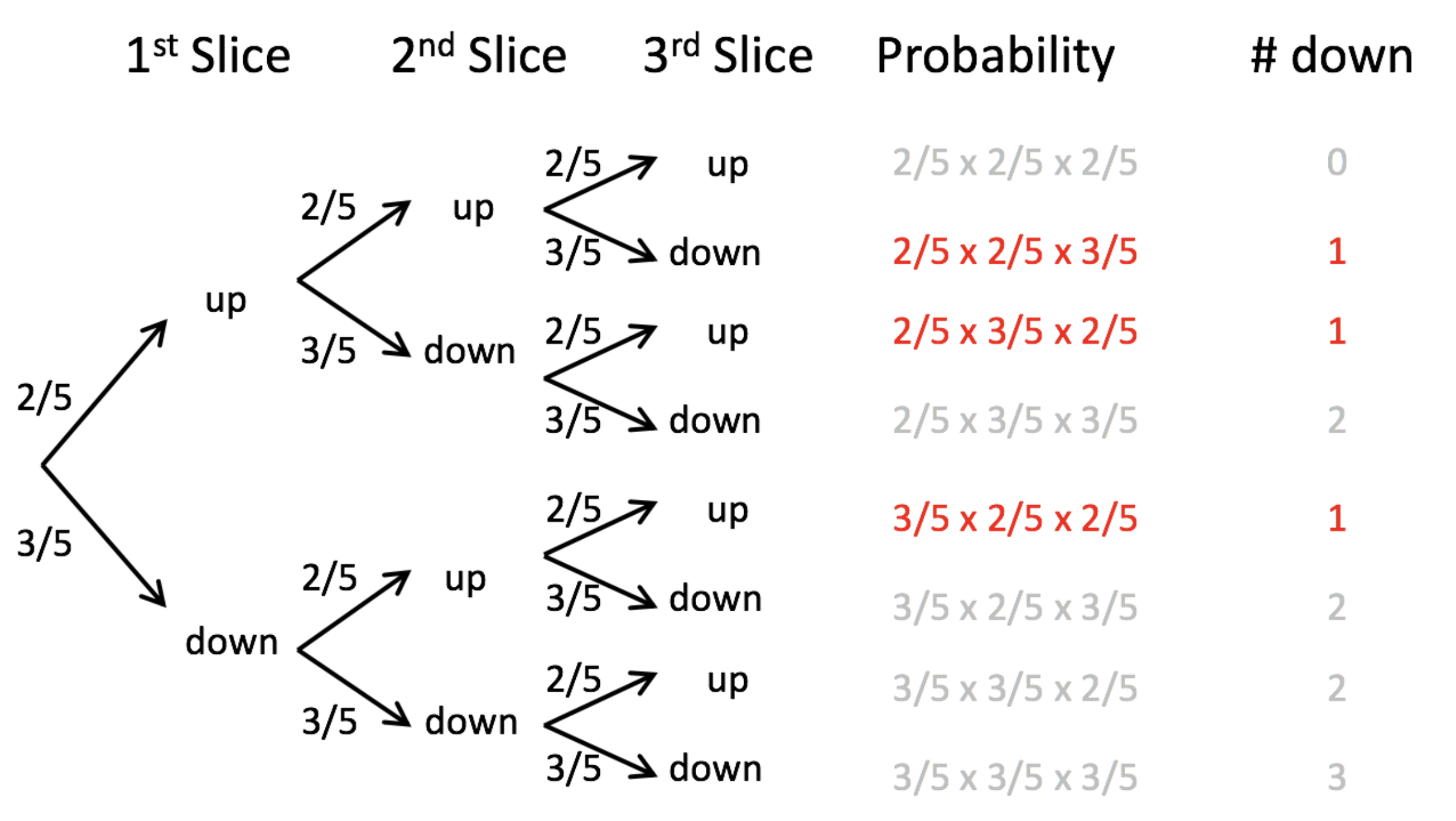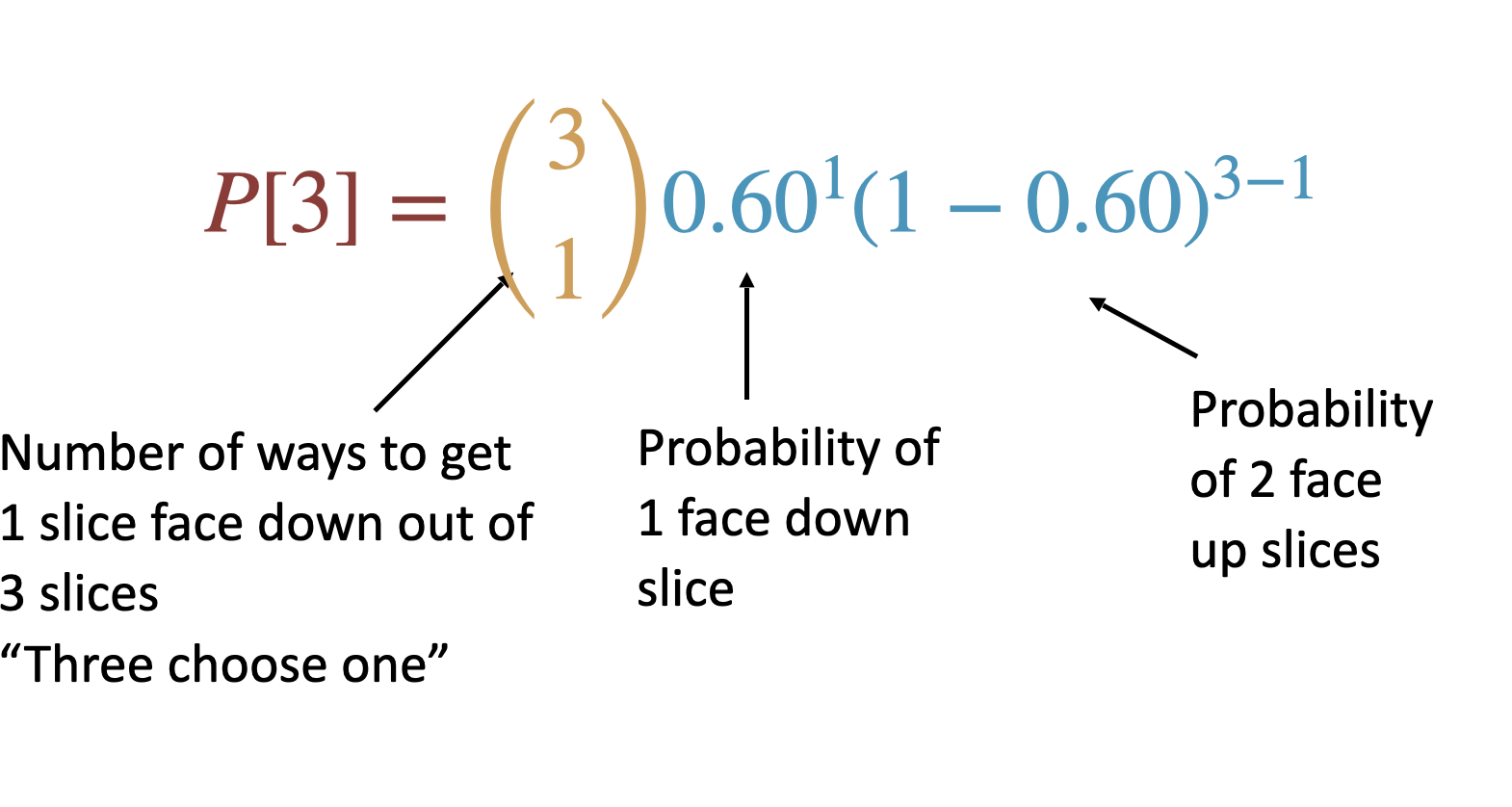 E.g. If three people drop their slice of toast, what is the probability that one falls butter side down and two fall butter side up?
