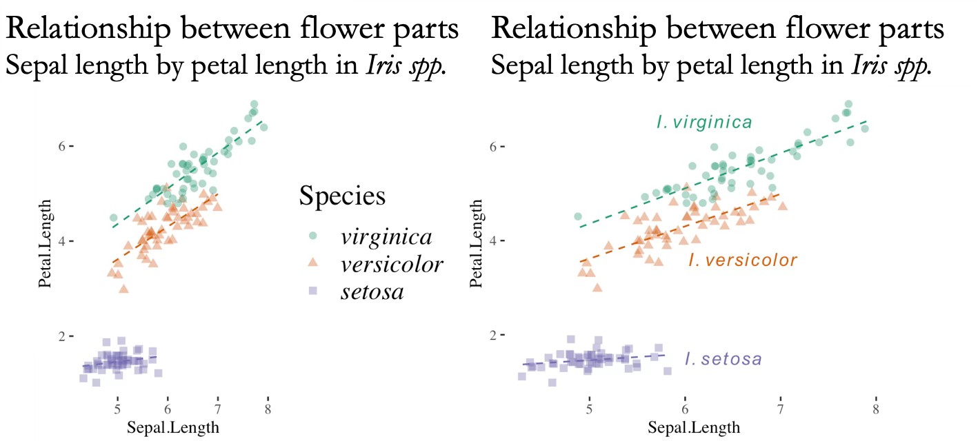Labels directly on plots may also help with clarifying patterns