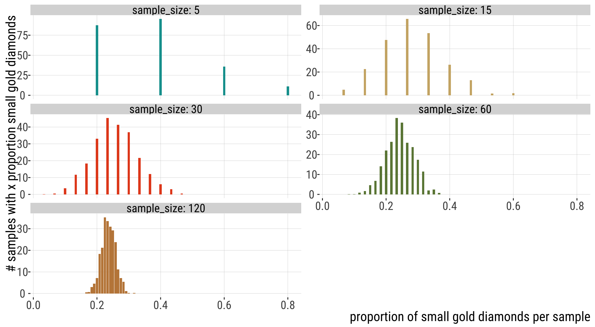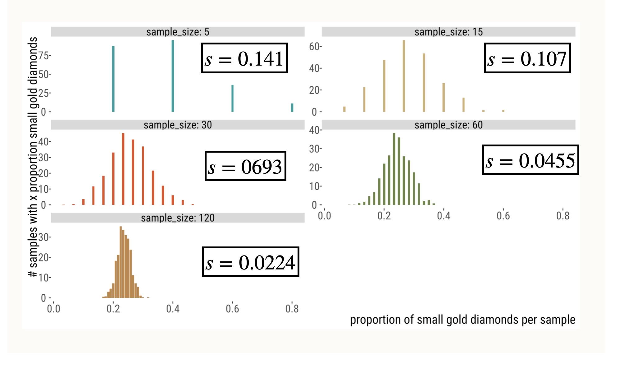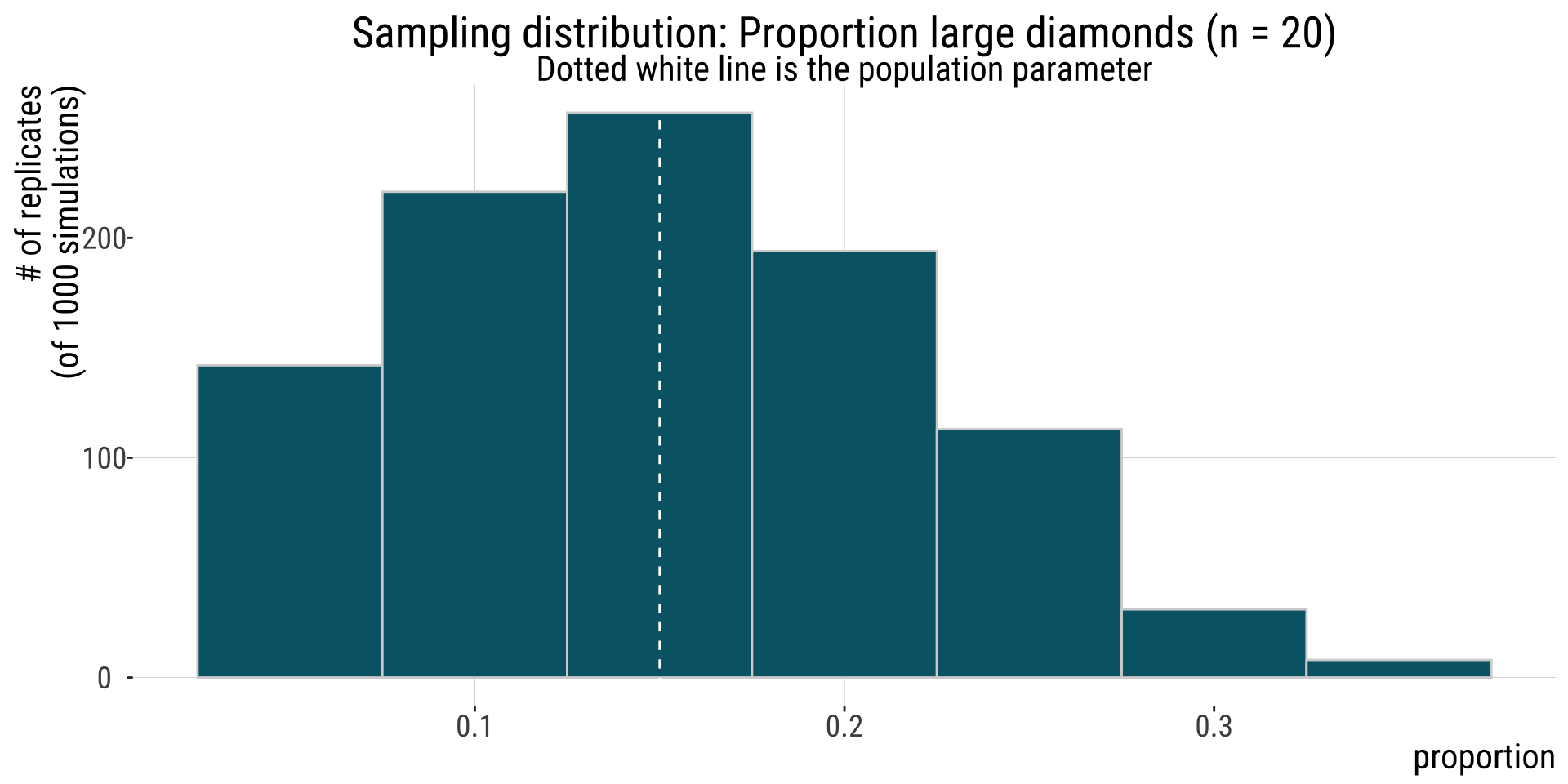 ggtitle(sprintf("Sampling distribution: Proportion large diamonds (n = %s)", star.sample.size),