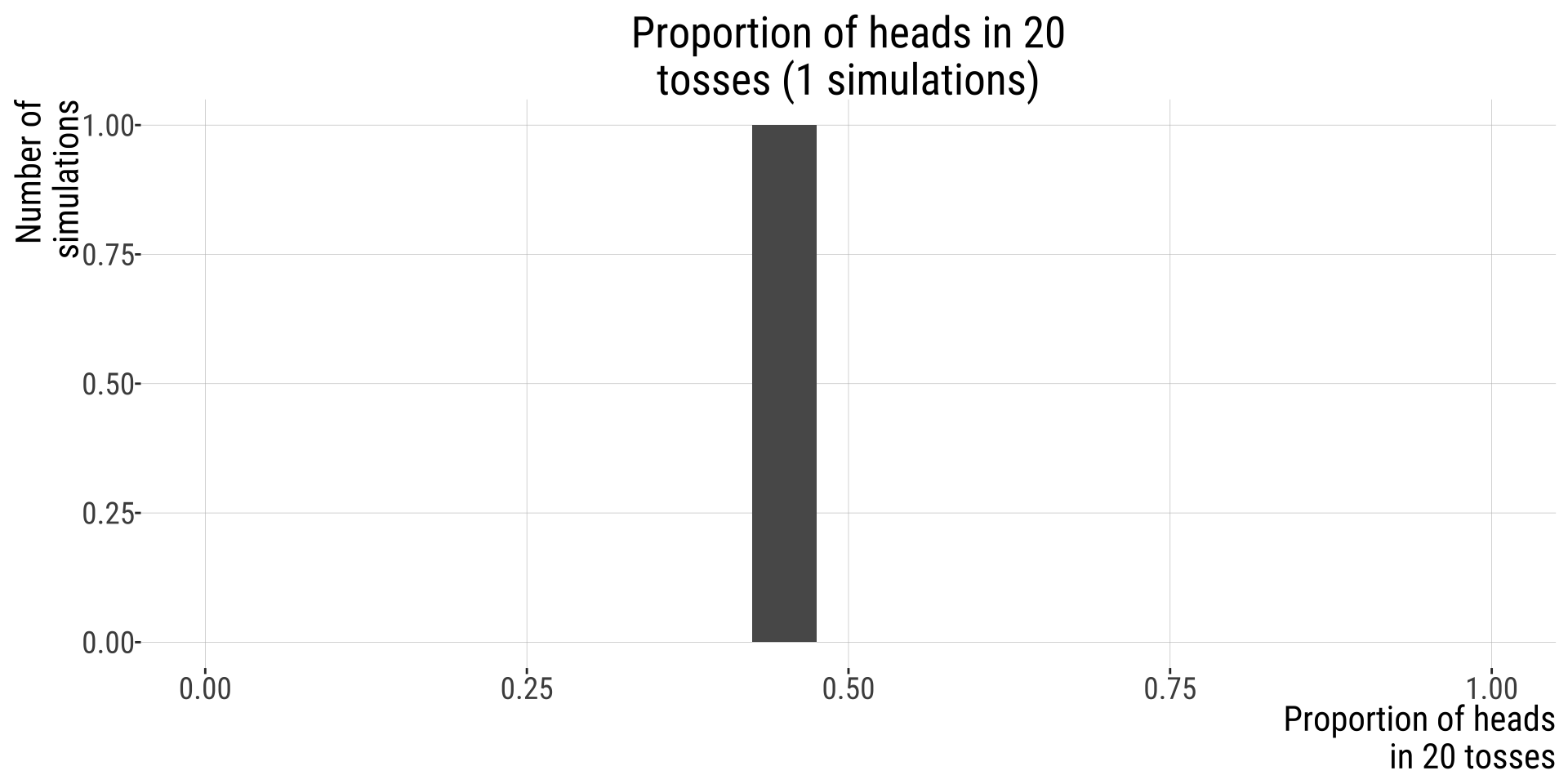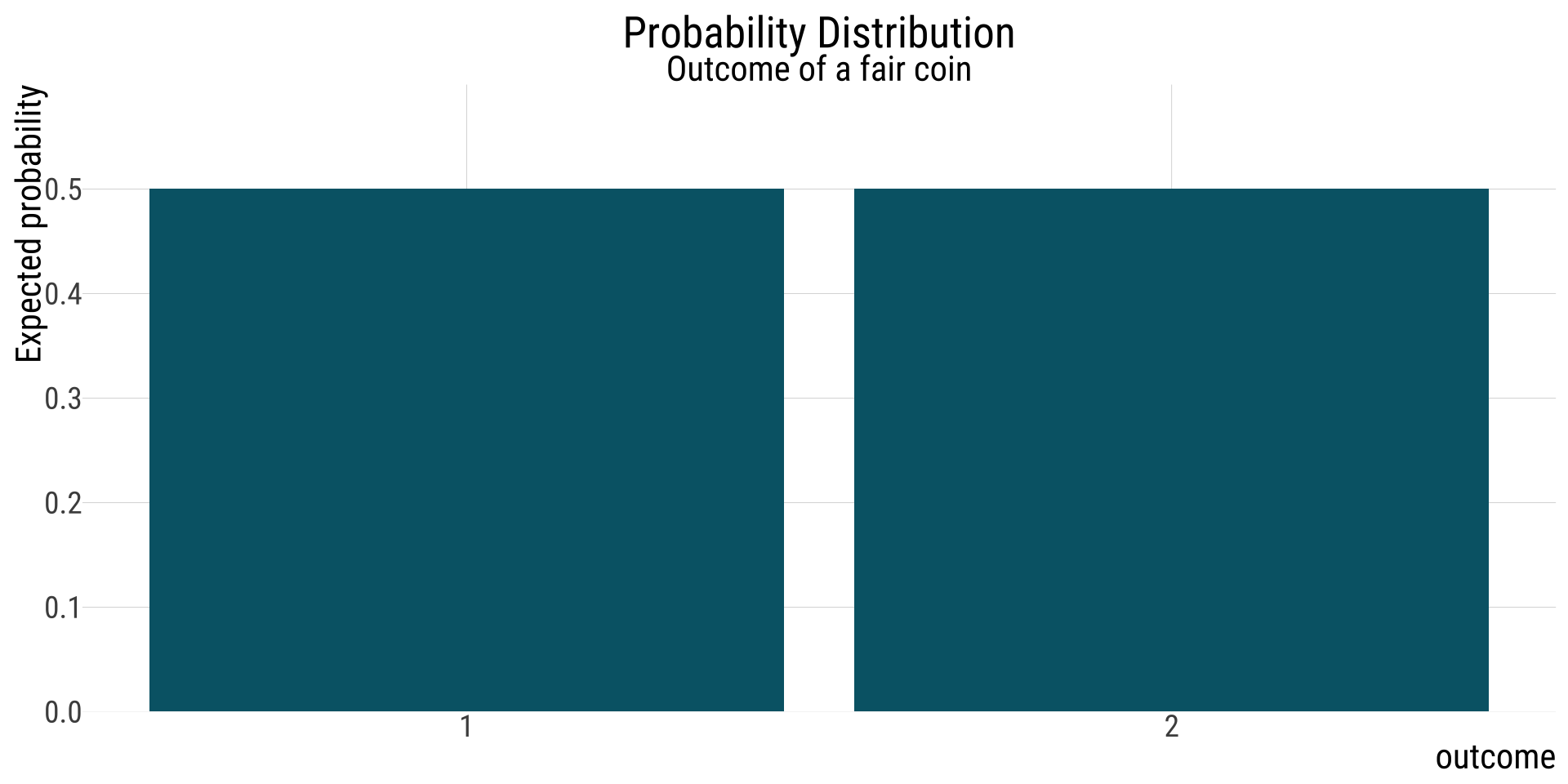 This probability distribution shows all possible outcomes of a single die roll and how likely they are. I.e., in the long term, if you roll the die MANY times, you would expect equal proportions of each result.