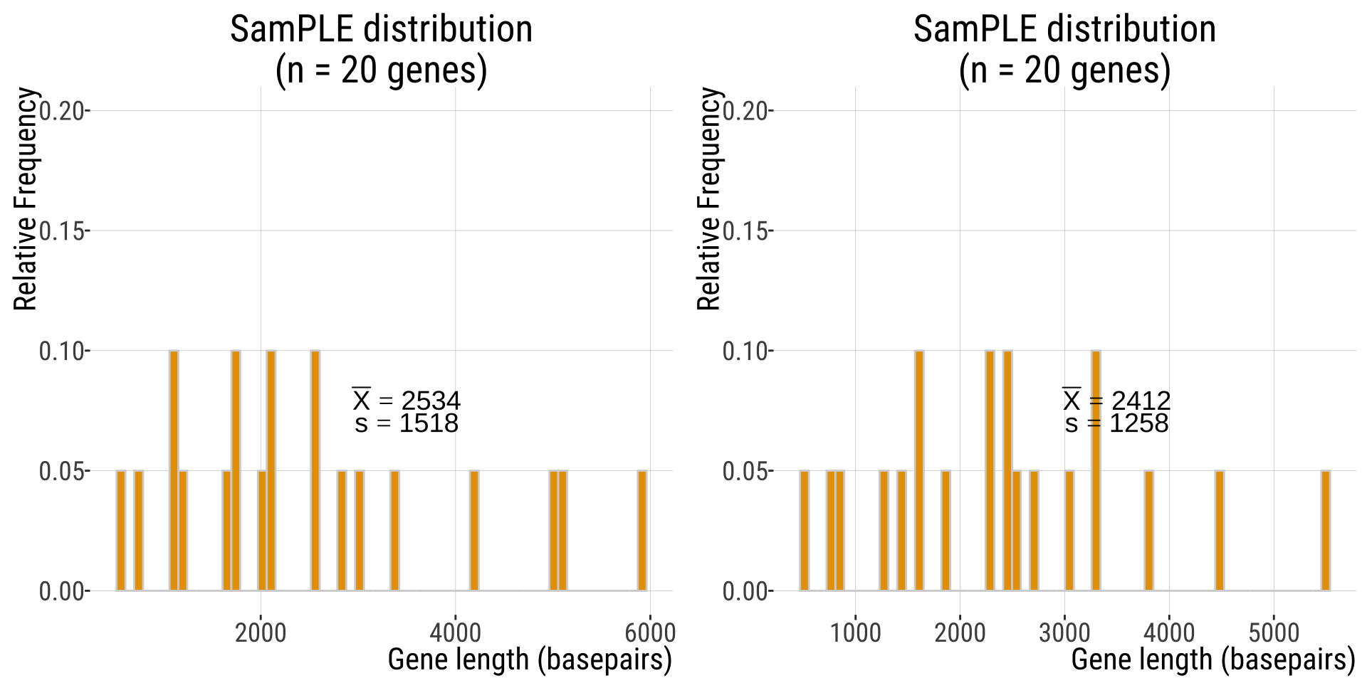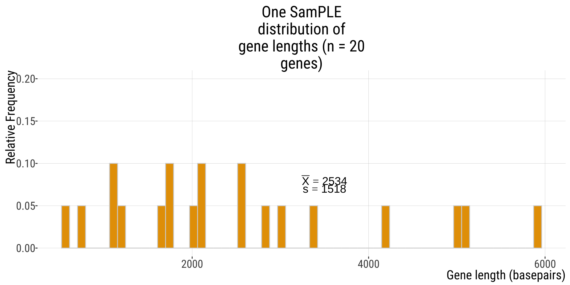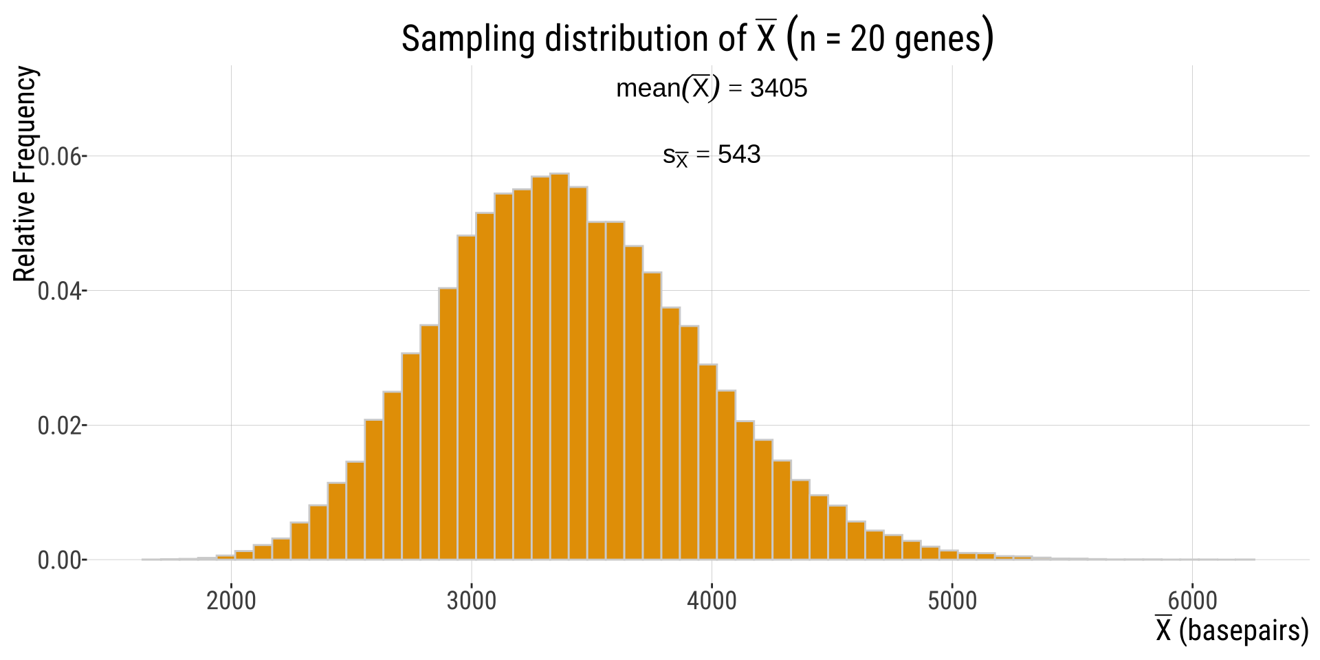 If instead of taking 3 independent samples of 20 genes we take, say, 100,000, we see a sampling distribution