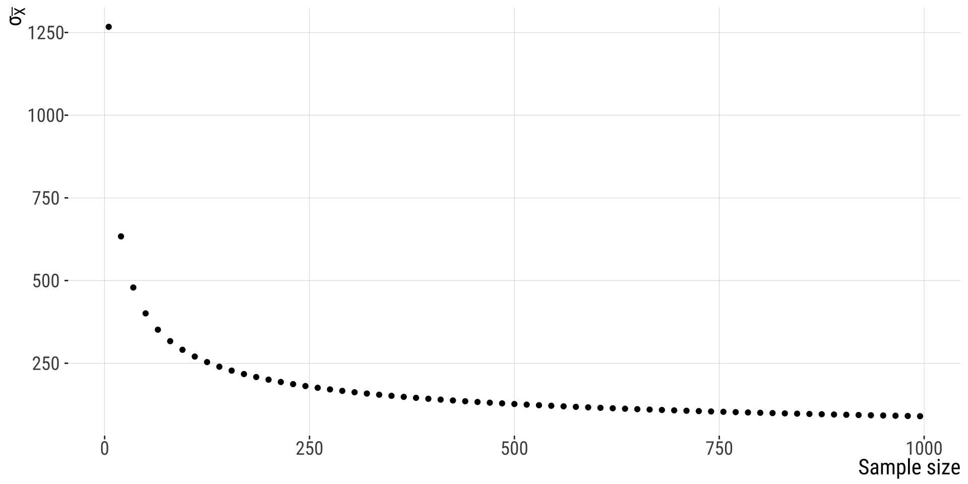 In our previous example, our first sample had \(\bar{X}=2533.9\) and \(s_{X}=1517.998\), so \(SEM_{\bar{X}}=\frac{1517.998}{\sqrt{20}}\approx339.4\)