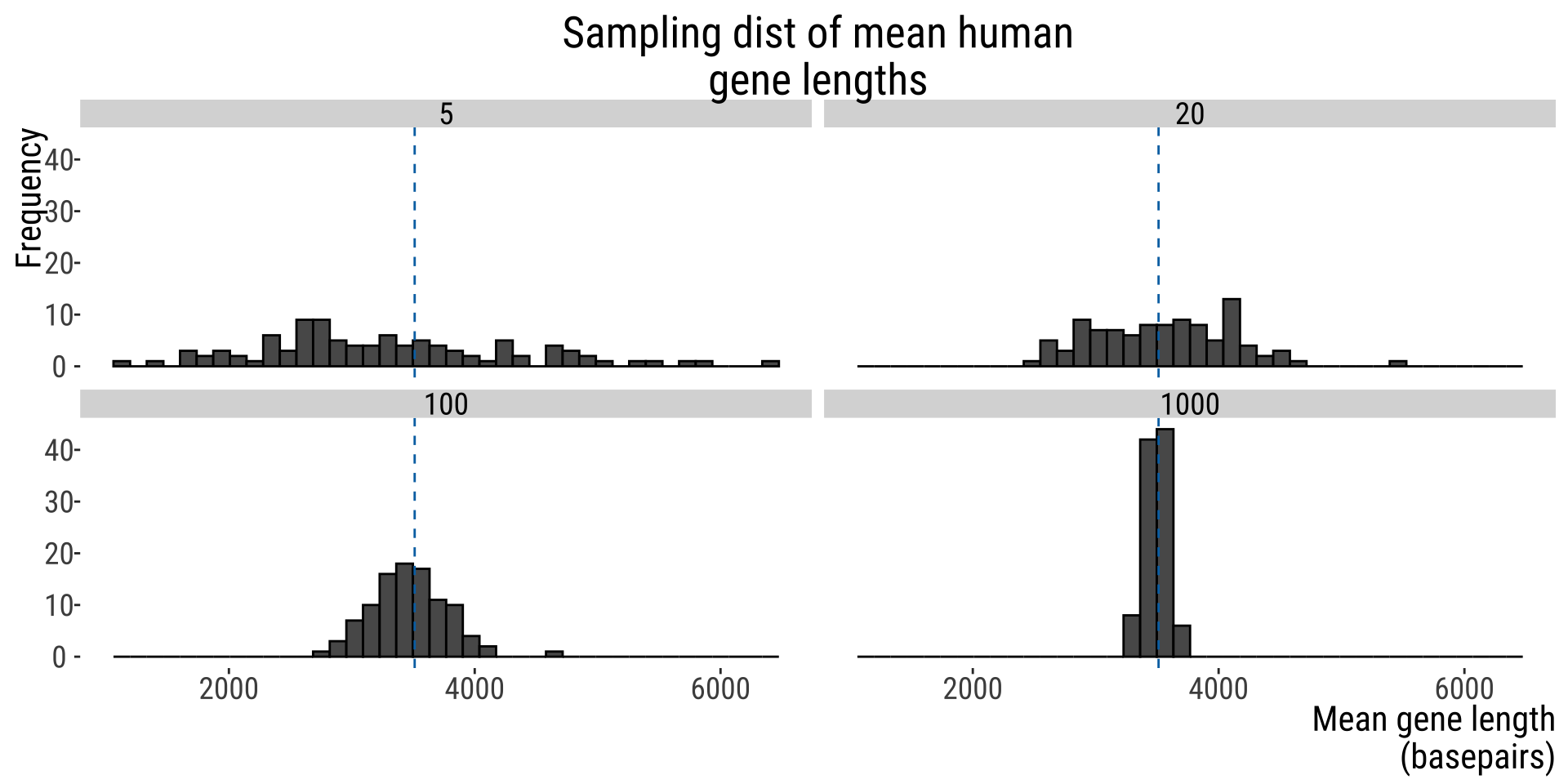 100 replicate of \(n=5\) genes samples from all human genes