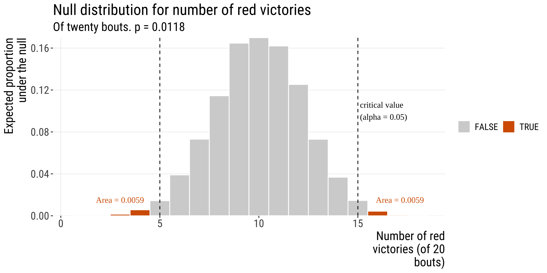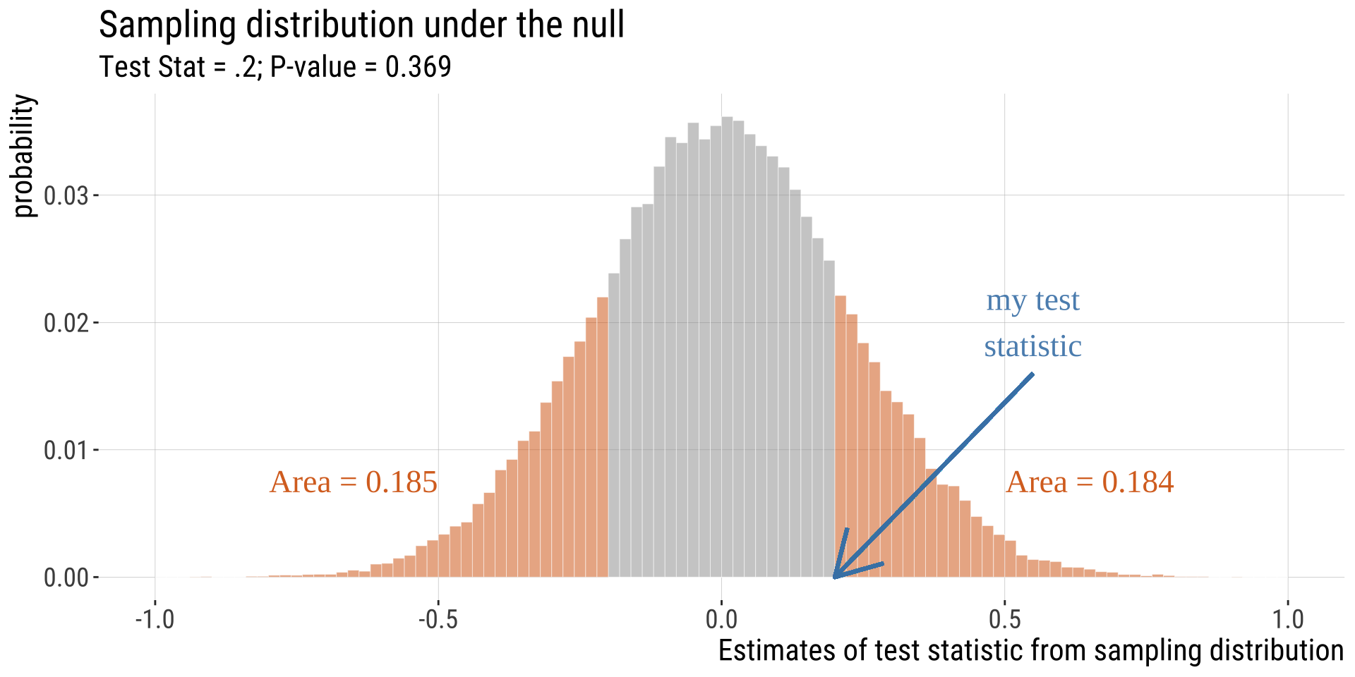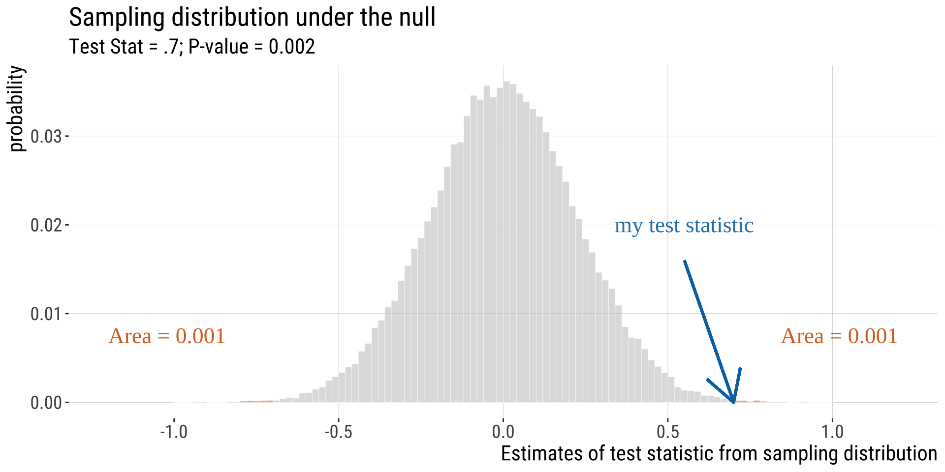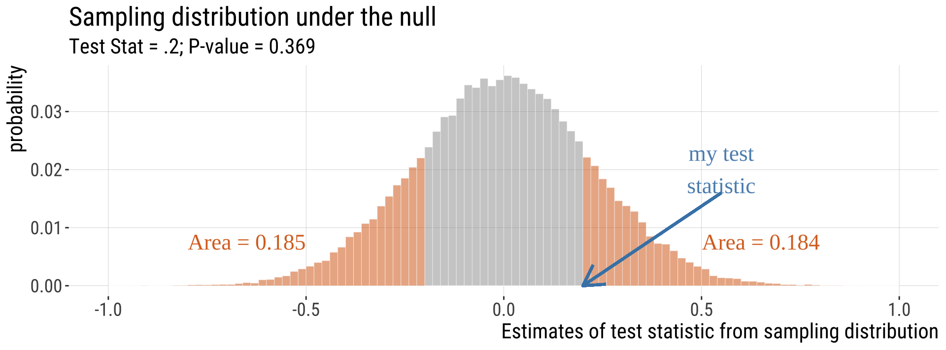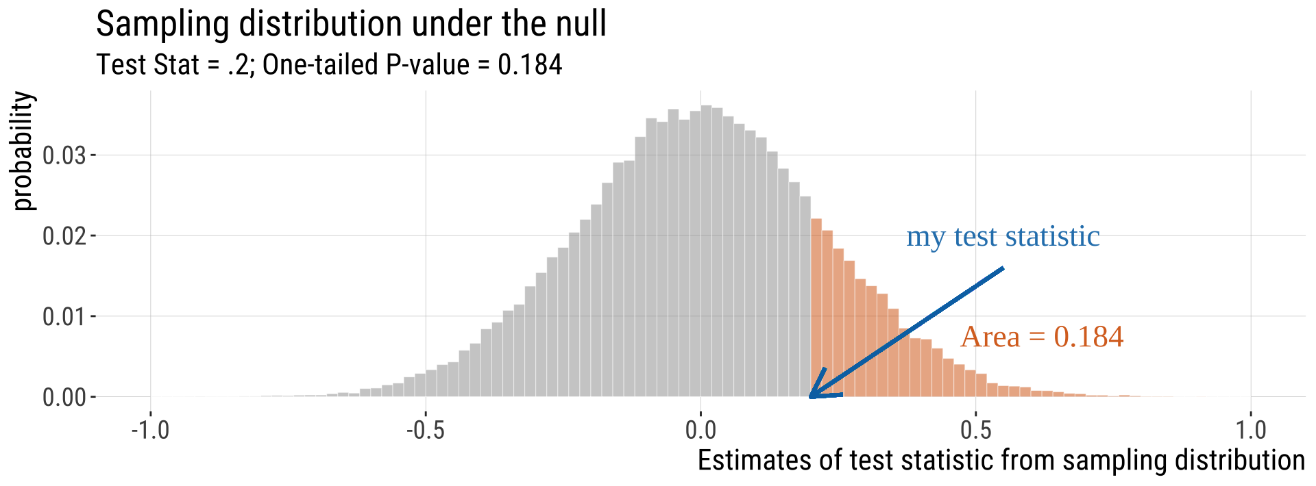 Notice that this is a conditional probability (\(P(\text{observed_effect}|\text{null hypothesis is true})\): The probability that something happens, given that various other conditions hold. One common misunderstanding is to neglect some or all of the conditions.