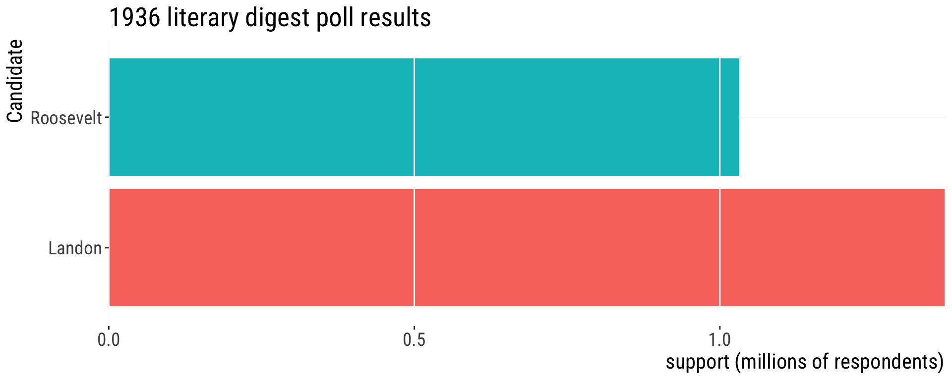 - Questionnaire was more likely to reach rich people (who could afford phones & attend book clubs) than those with fewer means.