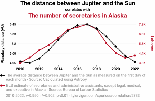 From: https://tylervigen.com/spurious/correlation/2733_the-distance-between-jupiter-and-the-sun_correlates-with_the-number-of-secretaries-in-alaska